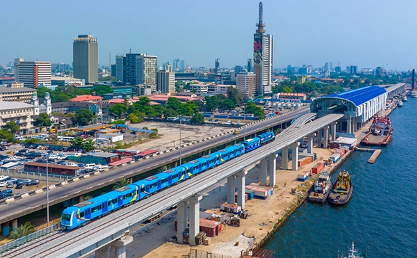这是尼日利亚拉各斯轻轨蓝线上的一列轻轨列车(2022年12月21日摄,无人机照片)。新华社发(托普·阿尤库 摄)